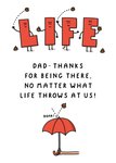 "Life" and "Dad- thanks for being there, no matter what life throws at us!". 'Dad- thanks for being there, no matter what life throws at us!' can be personalised!