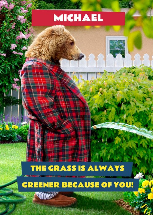 Front of card: Featuring a funny photograph of a bear watering a garden with a hose though the hose is obscured and it looks like it is peeing. Text reads: "Michael the grass is always greener because of you". 'Michael' can be personalised!