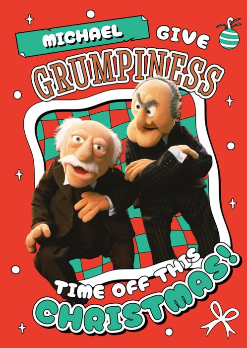 Featuring Statler and Waldorf from The Muppets at the centre, posed with their signature grumpy expressions. They appear in front of a wavy white frame containing a red and green chequered pattern, set against a bright red background with festive doodles such as bows, baubles and graphic accents.
