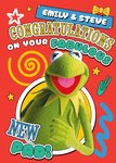 This modern, colourful design features Kermit the frog framed by a funny new home message featuring editable names. The design sits on a bright red background scattered with stars and swirls.