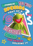 This modern, colourful design features Kermit the frog framed by a heartfelt Birthday message featuring an editable name. The design sits on a blue background scattered with stars, swirls and a bow.