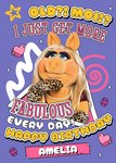 Featuring Miss Piggy wearing a leopard print outfit and pearl necklace. Surrounded by playful doodles, stars, hearts, and swirls with bold retro-style text, all on a purple background.