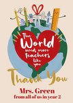 Features illustrations of a globe and stationary. Text reads "The world needs more teachers like you thank you Mrs. Green from all of is in year 2".
