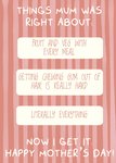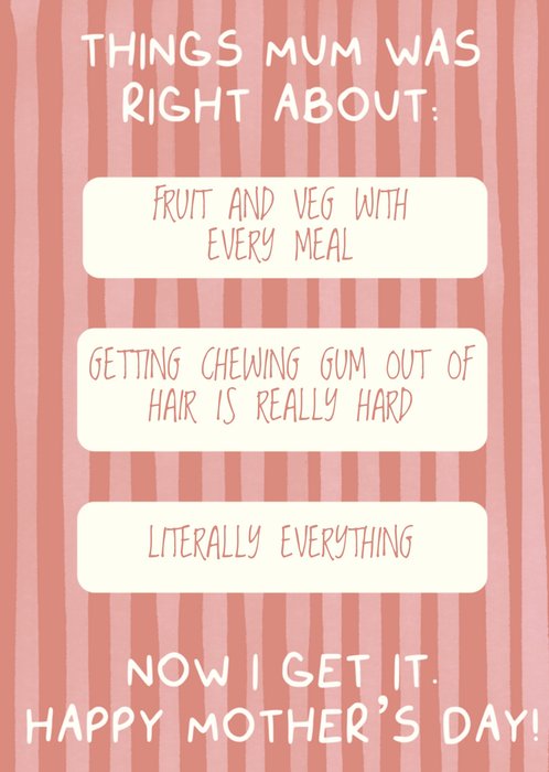 "Things mum was right about: Fruit and veg with every meal. Getting chewing gum out of hair is really hard. Literally everything. Now I get it. Happy Mother's Day!"