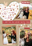 Front of card: Valentine's Day Photo Upload Card Three photo frames surrounded by hearts and foliage. Text reads: "Love of my life I am so in love with you". '