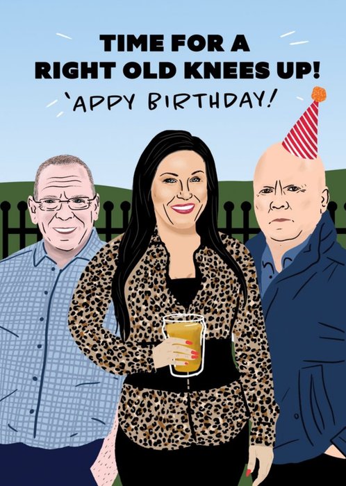 Front of card: Featuring an illustration of Ian, Kat and Phil from a British television soap opera. Text reads: "Time for a right old knees up 'appy birthday!".