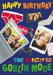 Front of card: Featuring illustrations including a laptop, a phone, a tablet, sweets and underwear with three photo frames. Text reads: "Happy birthday time to (party) go goblin mode".