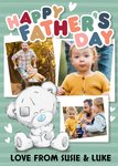 At the top of the card there is text that says 'Happy Father's Day'. Below are 3 photo upload boxes with a Tiny Tatty Teddy sketch slightly layered over them. At the bottom of the card there is a text editable section saying 'Love From Susie and Luke'