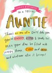 "Happy birthday to a special auntie there's no one else quite like you, you're funny, kind & lovely too! May your day be filled with happy things... cake and wine, and whatever else it brings!".
