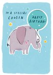 Featuring a cute cartoon elephant holding a balloon with stars around it on a light blue background.
