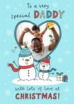 Front of card: Featuring a festive illustration of two snowmen with a heart shaped photo frame on a blue background. Text reads: "To a very special daddy with lots of love at Christmas!".
