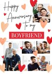Front of card: Featuring a collage of five photo frames surrounded by hearts. Text reads: "Happy anniversary to my boyfriend". 'boyfriend' can be personalised!
