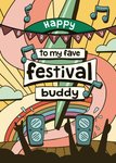 A vibrant and playful illustrated birthday card designed for a festival-loving friend. Featuring a lively music festival scene with a cheering crowd, speakers, and musical notes, this card is perfect for anyone who enjoys live music and festival vibes.