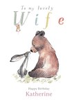 Front of card: Featuring an illustration of cute bear, a hare and a mouse. Text reads: "To my lovely wife happy birthday Katherine". 'Happy birthday Katherine' can be personalised!