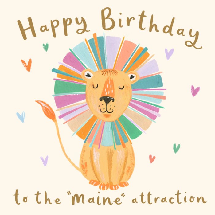 Featuring a cute illustrated lion with a colourful rainbow mane and small heart doodles on a cream background with gold coloured text.