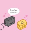 Front of card: Featuring a cute cartoon illustration of a toaster and toast with love hearts on a pink background and a white speech bubble above the toaster containing black typography.
