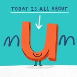 Featuring a playful illustration of the word 'Mum' with a large, smiling orange 'U' character and hand-drawn blue 'M's on a turquoise coloured background.
