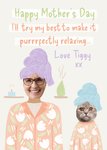 Text reads: "Happy Mother's Day, I'll try my best to make it purrrfectly relaxing... Love Tiggy xx."
