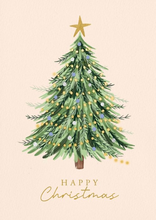 Front of card: Traditional watercolor painted card a Christmas tree decorated with baubles and lights, with a gold star on top of the tree. Text reads: "Happy Christmas."