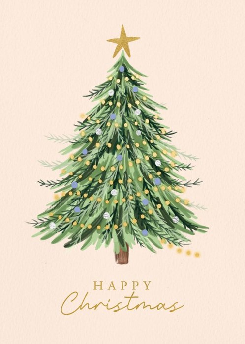 Front of postcard: Traditional watercolor painted postcard a Christmas tree decorated with baubles and lights, with a gold star on top of the tree. Text reads: "Happy Christmas."