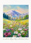 Featuring a landscape scene of a meadow of flowers with a mountain in the background, in an oil painting style, with text in a gold foil effect.