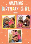 Front of card: 3 square photo upload areas each with a simple colourful frame on an orange background with small white triangles. Hand drawn white text with some colourful elements at the top with editable name. Text reads: "Amazing birthday girl Monica" With customisable name.