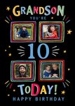 A fun and delightful Photo Upload Birthday card featuring a dark background that beautifully contrasts with the colourful text and stars, adding to the festive feel of the occasion. The main text is prominently displayed at the top in bold, vibrant letters, followed by an enthusiastic message, written in an array of lively colours and font sizes. The four photo upload areas are perfect for adding personalised photos that capture a unique moment in the grandson's life, from outdoor adventures to special celebrations, hinting at cherished memories and the joyous moments of childhood. Overall, the card exudes warmth and joy, marking a significant milestone in a young boy's life.