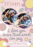 Front of card: Mother's Day Photo Upload Card Two circular photo frames surrounded by flowers. Text reads: "Mum I love you more than words can say happy Mother's Day". 'Happy Mother's Day' can be personalised!