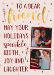 Front of card: 'To a dear friend' Photo Upload Christmas Card Two photo frames with glittery snow and sparkles. Text reads: "To a dear friend may your holiday sparkle with joy and laughter".