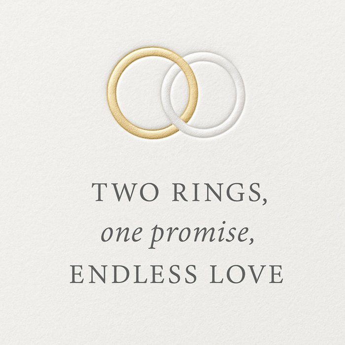 Featuring two interlocking rings in gold and white above the centred text on a soft cream background, this greeting card has a simple, elegant wedding theme.