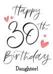 Front of Card: Black calligraphy on white background surrounded by pink hearts. Text reads: Happy 30th Birthday Daughter! With customisable text options