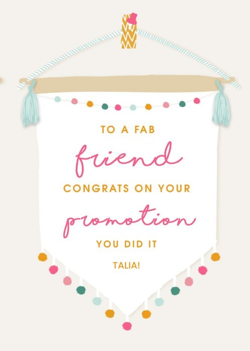 Front of card: Typographic design sitting on an illustrated banner on a cream background The text reads: "To A Fab Friend Congrats On Your Promotion You Did It Talia"