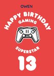 Front of card: Bold typography on a red background. Navy editable name above white text which is curving round a graphic illustration of a computer game controller. Underneath is more curved white text and a large white number 13. Text reads: “Owen happy birthday gaming superstar 13” With customisable name.