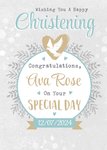 Front of card: Typographic design featuring a central circular panel with a floral border and loveheart at the top and a banner at the bottom, all on a grey textured background Text reads: "Wishing You A Happy Christening Congratulations Ava Rose On Your Special Day 12 July 2023"