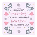 Front of card: In loving Memory Mother's Day Card Typography on a heart and foliage pattern background. Text reads: "In loving memory of your amazing mum this Mother's Day".