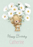 Front of card: Featuring Uddle holding a big of daisies on a pastel green, textured background. There is text at the bottom of the card in a mix of upper case and hand written style font in pink and grey.
