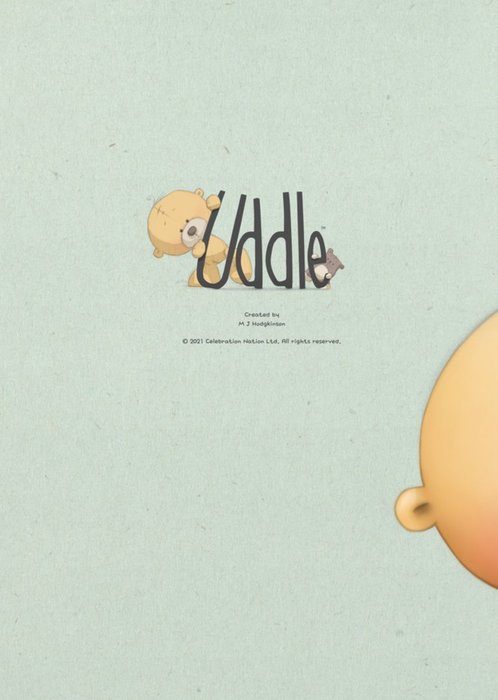 Front of card: Featuring a seasonal scene with Uddle wearing a Christmas hat and carrying a large bunch of festive flowers. The illustration sits on a wintery background scattered with snowflakes. Text reads: "Merry Christmas Carol & David". 'Carol & David' can be personalised.