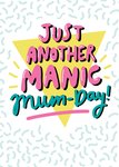 A bold and bright Mother's Day card featuring colourful, in-your-face, 90s retro-style bubbly text with an upsidedown triangle and thick squiggles in the background.