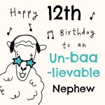 "Happy 12th birthday to an un-baa-lievable nephew". '12th' and 'Nephew' can be personalised!