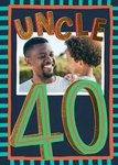 Front of card: Featuring colourful, hand-painted effect typography with one rectangular photo upload frame. The card is adorned with decorative painted stripes in various colours against a dark blue background embellished by diagonal teal stripes. There is a big number 40 in the centre with a gold foil 3D text embellishment. It’s a personalised card celebrating an Uncle's 40th Birthday with enthusiasm and admiration.