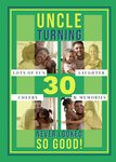 Featuring vibrant, bold typography with four rectangular photo frames encased in a double-lined yellow & blue border on a bold green background. The design suggests it's a Birthday card for a beloved Uncle.