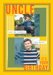Featuring vibrant, bold typography with two rectangular photo frames encased in a double-lined red & blue border on a bold yellow background. There are strips of silver foil lines throughout the design. The design suggests it's a Birthday card for a beloved Uncle.