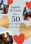 Celebratory greeting card for Auntie and Uncle, featuring a bold “50”, flowing script and clusters of red and gold hearts, with rounded photo frames tucked into each corner, marking half a century of love, on a soft light blue background.