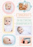 Front of card: Grandparents Photo Upload New Baby Card Various photo frames on a white speckly background. Text reads: "Congrats on becoming grandparents".