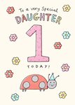 A modern design featuring a large central '1' with a hand-written message above, and a cheerful ladybird below, surrounded by playful hand-drawn flowers. The design has a pale cream background.