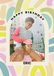 Front of card: A vibrant and sweet Birthday Card featuring an arch-shaped photo upload frame with abstract, bright, colourful, pastel brushstroke paint marks In the background.