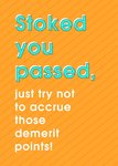 Front of card: Driving Test Congratulations Card Vibrant typography on a striped orange background. Text reads: "Stoked you passed, just try not to accrue those demerit points".