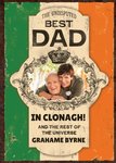 Front of card: The Undisputed Best Dad photo upload Birthday Card Decorative vintage frame and crown with an Irish flag on a rustic metal background. Text reads: "The undisputed best Dad in Clonagh!" and "and the rest of the universe Grahame Byrne". 'in Clonagh!' and 'Grahame Byrne' can be personalised!