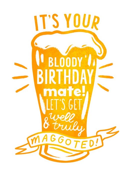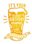 Front of card: 'Let's get well and truly maggoted!' Birthday Card Vintage illustration of a pint of beer with various typography. Text reads: "It's your bloody birthday mate! Let's get well & truly maggoted".
