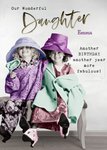 Front of card: Recoloured black and white photo of two young girls playing dressing up with colourful adult clothing with editable typographic text. Text reads: "Our wonderful Daughter Emma. Another birthday another year more fabulous!" With customisable name.